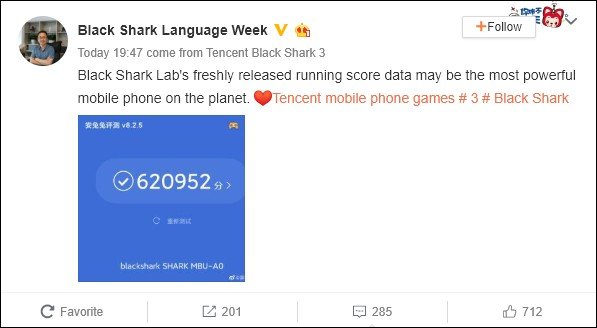 Генеральный директор бренда Black Shark продемонстрировал скриншот AnTuTu, где видно, что смартфон набирает 620 952 балла!