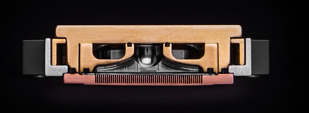 Производитель отмечает, что все детали водоблока изготавливаются не литьем или штамповкой, а фрезеровкой на станке с ЧПУ из цельного куска материала. В основании сформирован массив микроканалов шириной 0,40 мм между ребрами толщиной 0,26 мм, который занимает на 50% большую площадь, чем в водоблоках предыдущего поколения. Поверхность основания, прилегающая к крышке процессора, повторяет ее форму, но возможен заказ плоского основания, рассчитанного на процессоры с отшлифованными крышками.